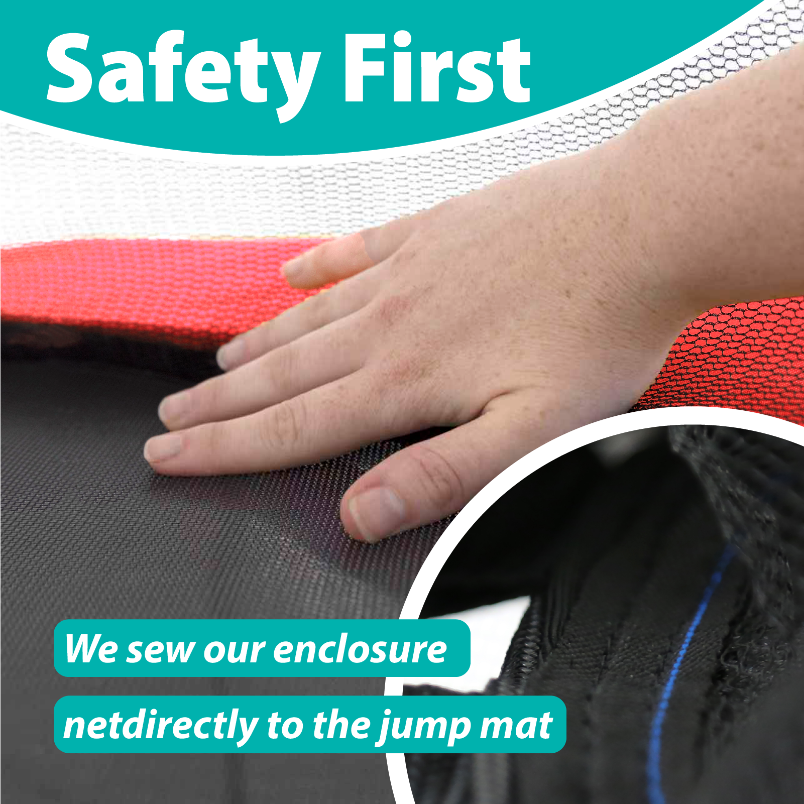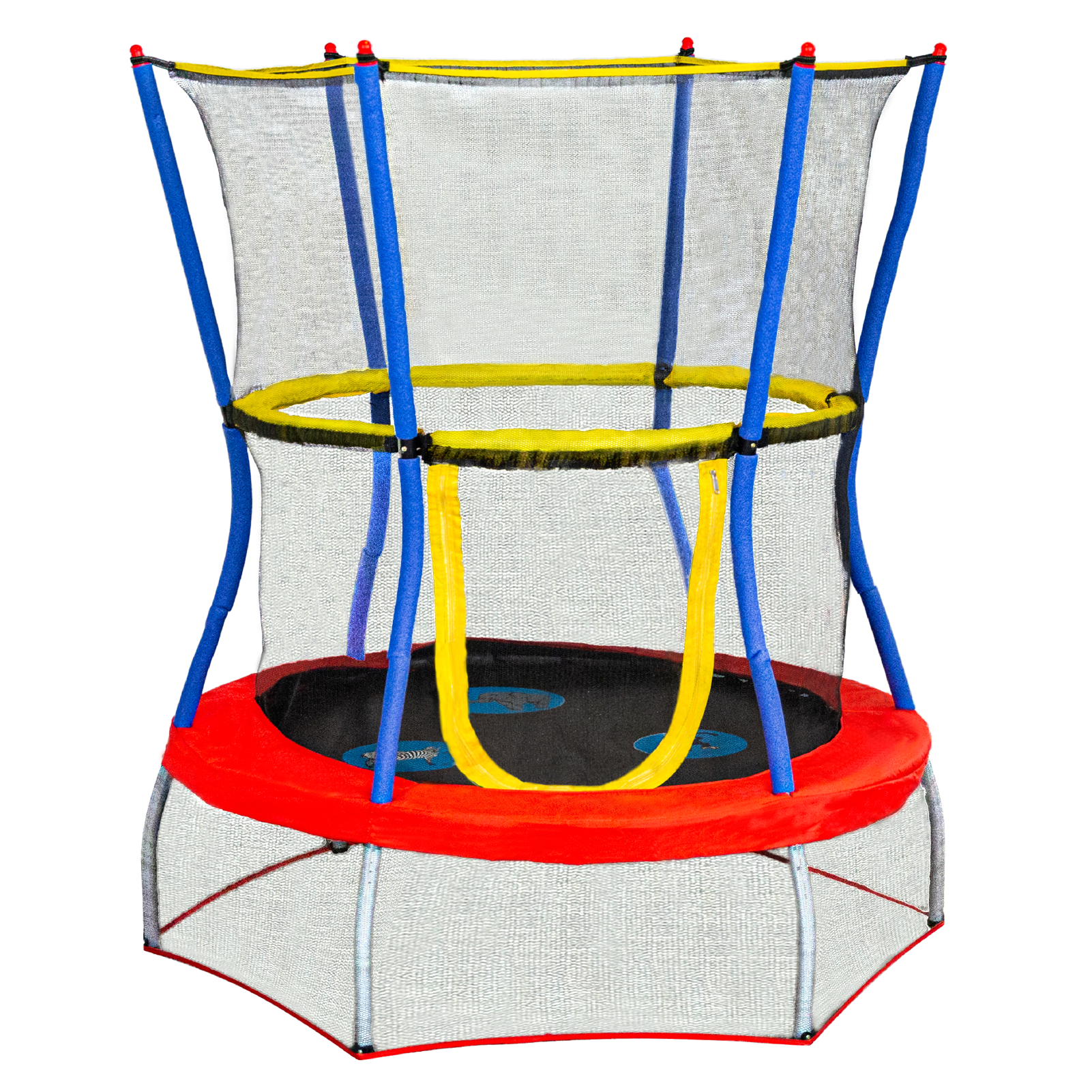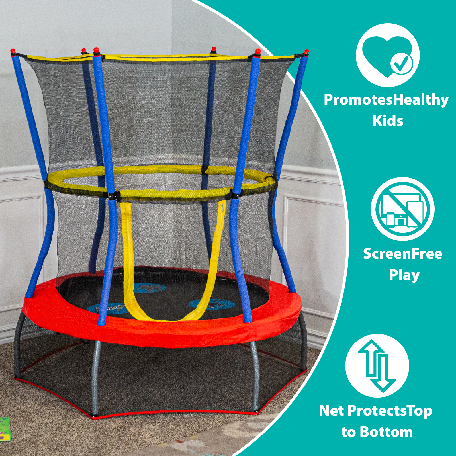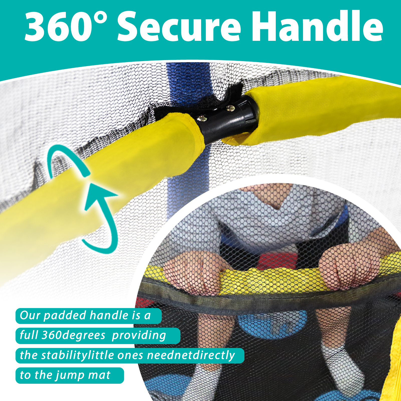 - DESIGN: Our mini indoor trampolines are designed with protection in mind. This mini trampoline features 30 stretch bands instead of steel springs, and a soft frame pad covers the stretch bands to prevent any pinch points. A 360-degree padded handlebar offers stability for your little jumper, and the enclosure net is sewn directly to the jump mat, eliminating gaps.